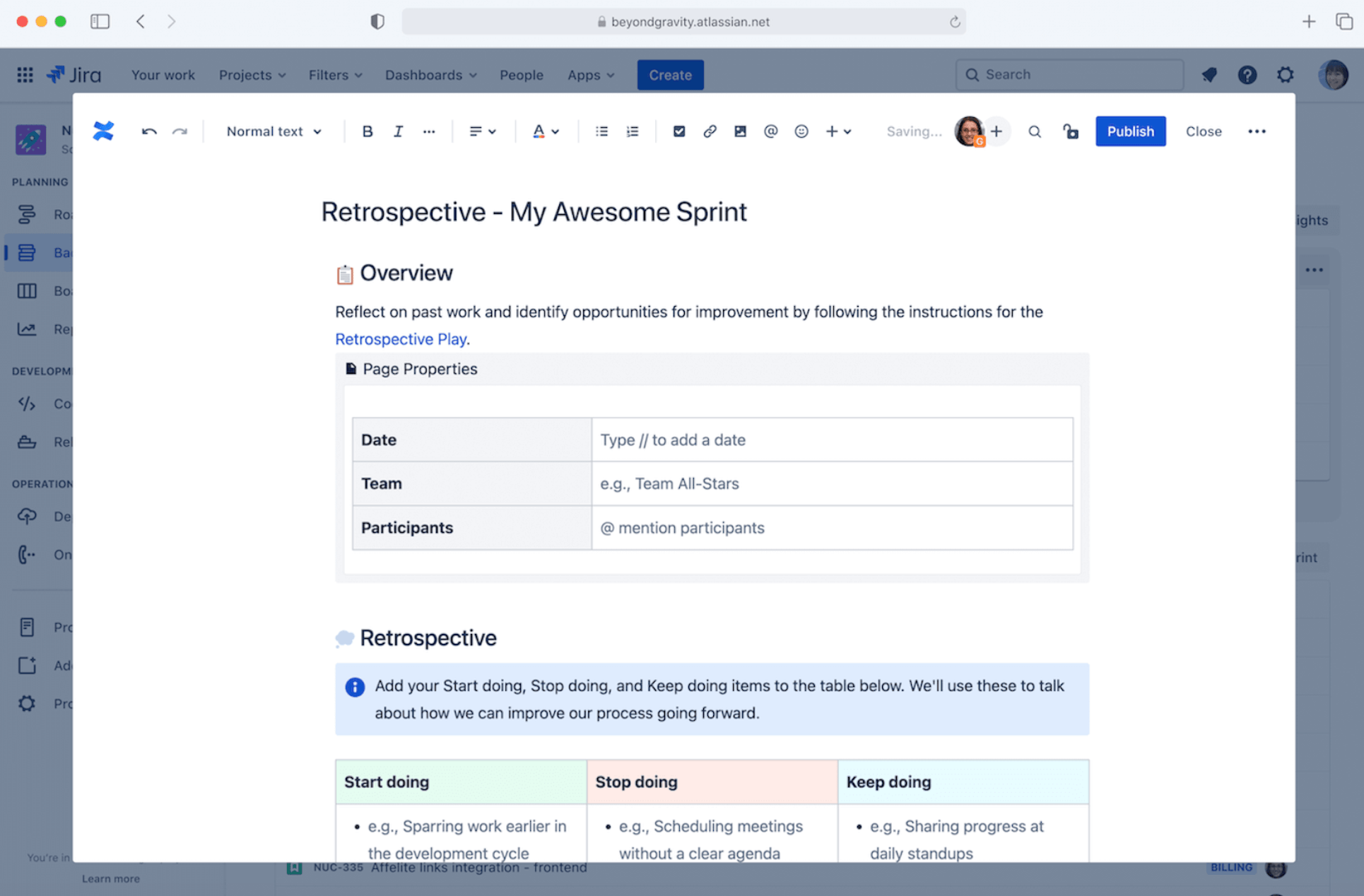 Wenn ein Sprint komplettiert wird, haben Teams, die Confluence und Jira einsetzen, die Möglichkeit, mithilfe der Retrospektiven-Vorlage eine entsprechende Seite in Confluence vorzubereiten. Es genügt, in Jira die Box „Create a retrospective page for this sprint“ zu aktivieren – den Rest übernehmen die Systeme von selbst. Die Retrospektive ist automatisch mit dem Burndown-Chart des Sprints verknüpft. Während das Team also seine Retro dokumentiert, sind die zentralen Metriken der zurückliegenden Entwicklungsperiode stets präsent.